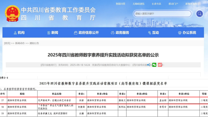 近日,四川省教育厅公布了2025年四川省教师数字素养提升实践活动拟获奖名单。学院朱颖教师团队微课作品荣获二等奖。同时,该作品拟被推荐参加“2025年全国师生数字素养提升实践活动(第二十九届教师活动)”。此次获奖体现了学院教师的信息化教育教学能力,彰显了教师借助数字化推动课堂教学提质增效的实践成果。接下来,学